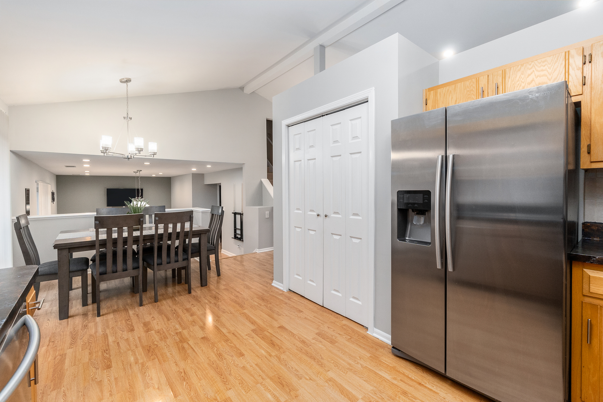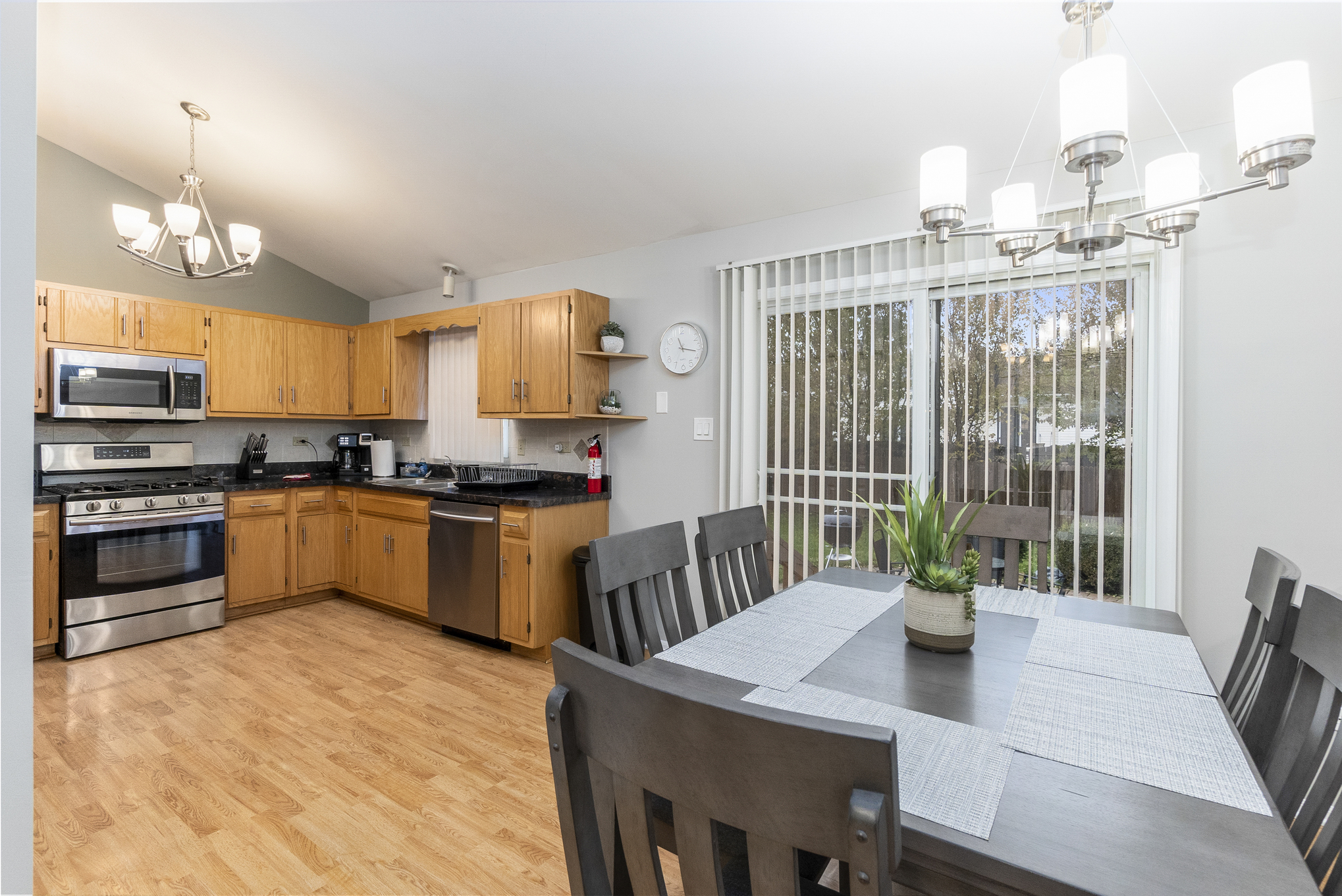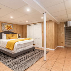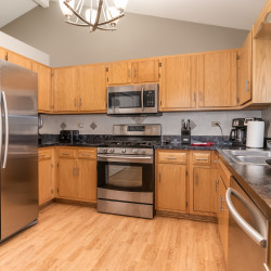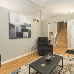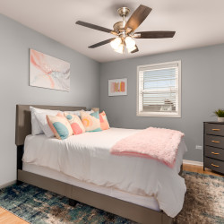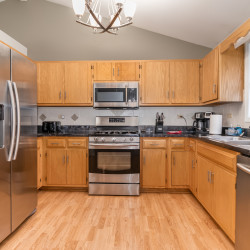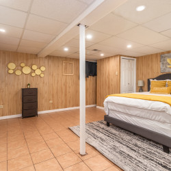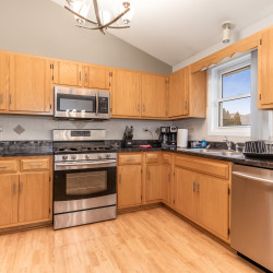 This 3,000 split level-style home is located in Aurora IL, a beautiful western suburb of Chicago! Nestled in a quiet, family-friendly neighborhood, this home features 5 bedrooms and 3 full bathrooms. The master bedroom has a king-size bed and an ensuite bathroom! The remaining 4 bedrooms all have queen-size beds! The home also has space for the 1 air mattress on-site (total of 6 beds). The kitchen features stainless steel appliances and plenty of cookware for an enjoyable meantime experience!